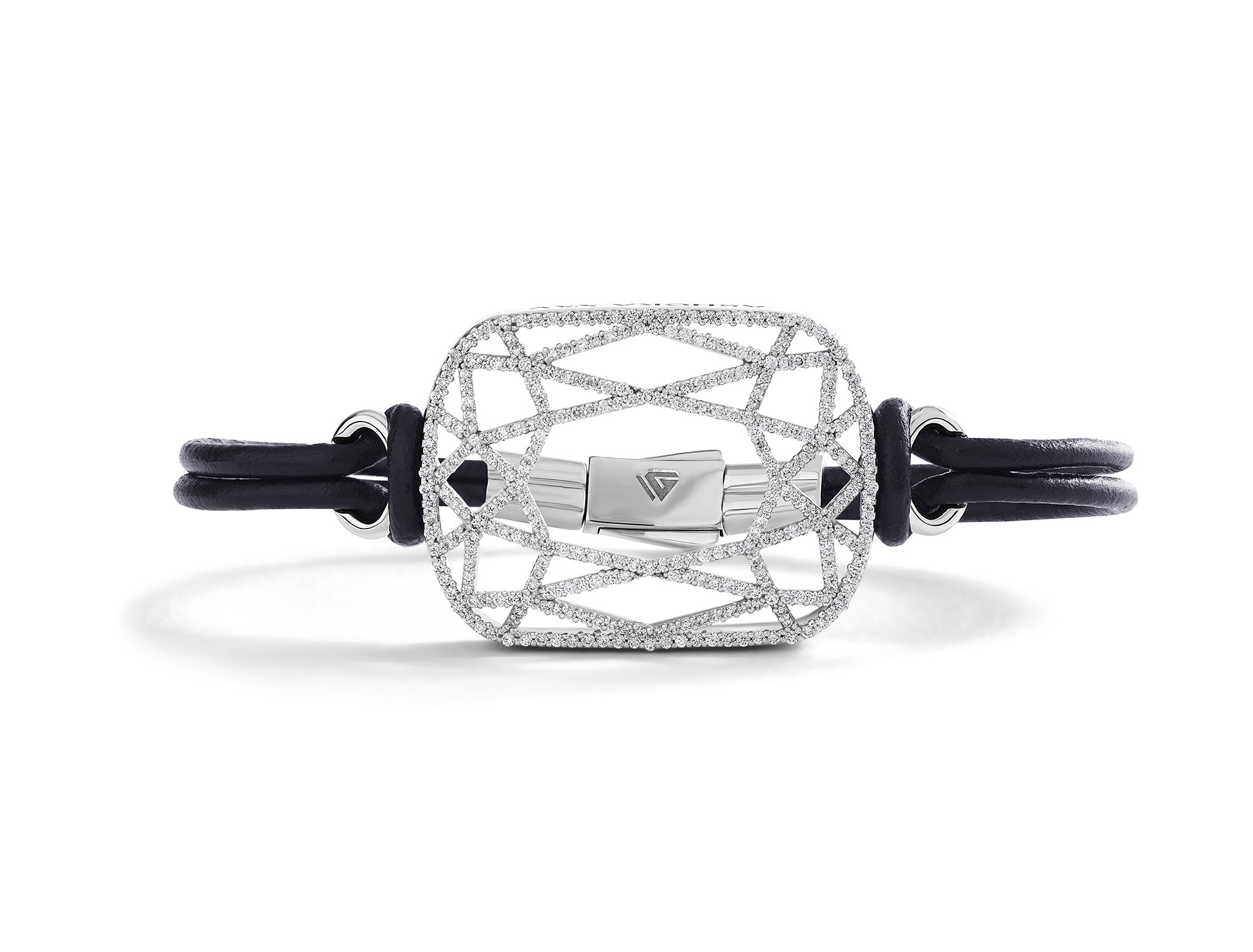 Limited-edition Removal of Sorrow ASHOKA® Talisman Bracelet, celebrating the 25th anniversary of the ASHOKA®. The bracelet features a diamond pavé face ASHOKA® motif in 18k white gold on a black cord.